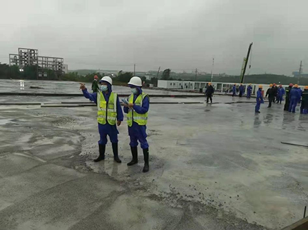 公司突擊隊員分駐在項目北區(qū)和南區(qū),每天分兩班,交接班時間為早上8時和晚上8時,他們兢兢業(yè)業(yè),任勞任怨?,F(xiàn)場監(jiān)理人員要對板房組裝、材料進場及時進行檢查驗收,并對材料數(shù)量進行確認(rèn)簽證;旁站混凝土澆筑,確保項目質(zhì)量;與建設(shè)單位和施工單位交接土方施工事宜;同建設(shè)單位協(xié)調(diào)施工現(xiàn)場交通,測量碎石墊層范圍,確定墊層厚度;督促施工單位按計劃完成工程量,要求他們編制橫道圖進度計劃表,及時增加人員和設(shè)備,保證按期完成。