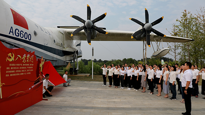 活動中,全體黨員沿著極客公園“紅色航班”線路開展實地參觀學(xué)習(xí)。在園區(qū)東大門廣場,全體黨員舉行了升國旗、唱國歌儀式,觀看了極客公園制作的《我和我的祖國》視頻,并認(rèn)真聆聽了水轟5、鯤龍AG600等國產(chǎn)大型飛機(jī)的研發(fā)故事,隨后在AG600飛機(jī)前重溫入黨誓詞;同時,還參觀了園區(qū)幻境球幕影院、三棲模型基地、戰(zhàn)斗機(jī)群、熱氣球主會場、飛行營地、航空文化展示帶等特色項目。