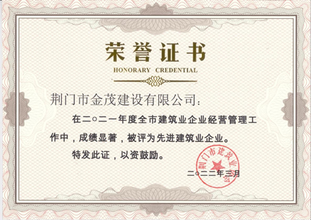 近日,市城控集團(tuán)所屬子公司金茂公司被荊門市建筑業(yè)協(xié)會評為2021年度先進(jìn)建筑業(yè)企業(yè),這是金茂公司自2020年獲此榮譽(yù)后的又一次蟬聯(lián),進(jìn)一步提升了公司在荊門建筑業(yè)的行業(yè)地位,增強(qiáng)了公司品牌效應(yīng)。