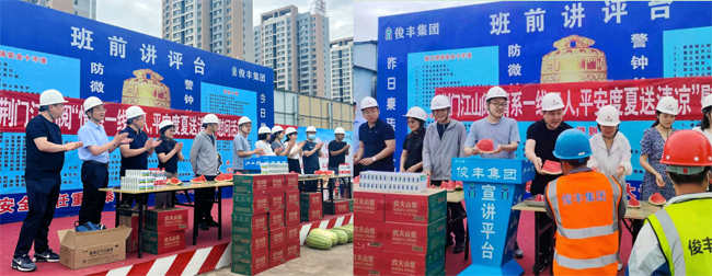 在各項目現(xiàn)場,俊豐綠建集團負責人向高溫下堅守崗位、認真工作的一線員工表示親切問候與關心,感謝他們?yōu)楣景l(fā)展作出的貢獻。在發(fā)放慰問品的同時,他強調(diào),一線管理人員要合理調(diào)整工作時間,妥善安排員工休息時間,充分利用現(xiàn)有技術條件,讓每一位員工都能在舒適的環(huán)境下參與到生產(chǎn)作業(yè)當中去,公司工會將全力做好后勤保障工作,為一線服務。