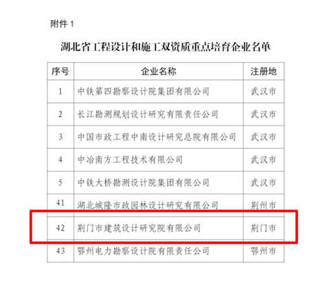 荊門市建筑設(shè)計研究院有限公司入選湖北省工程設(shè)計和施工雙資質(zhì)重點(diǎn)培育企業(yè)