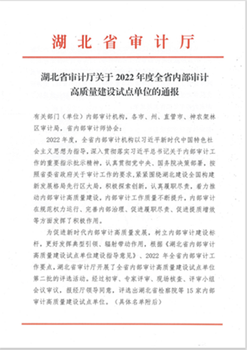近期,湖北省審計(jì)廳發(fā)布《湖北省審計(jì)廳關(guān)于2022年度全省內(nèi)部審計(jì)高質(zhì)量建設(shè)試點(diǎn)單位的通報(bào)》,荊門城控集團(tuán)被成功評(píng)為湖北省內(nèi)部審計(jì)高質(zhì)量建設(shè)試點(diǎn)單位。