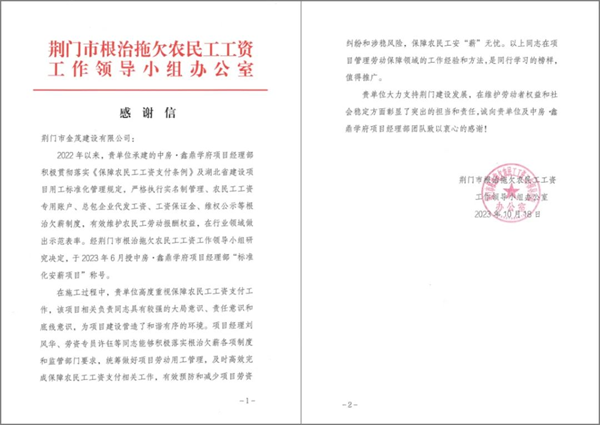 近日,中房集團(tuán)荊門公司所屬金茂建設(shè)公司收到來自荊門市根治拖欠農(nóng)民工工資工作領(lǐng)導(dǎo)小組辦公室的感謝信,對(duì)該公司承建的中房?鑫鼎學(xué)府項(xiàng)目嚴(yán)格執(zhí)行實(shí)名制管理、高度重視保障農(nóng)民工工資支付、有效維護(hù)農(nóng)民工勞動(dòng)報(bào)酬權(quán)益、在行業(yè)領(lǐng)域作出示范表率,以及該項(xiàng)目經(jīng)理劉風(fēng)華、勞資專員許鈺等同志積極落實(shí)根治欠薪制度作出的積極貢獻(xiàn)表示肯定。