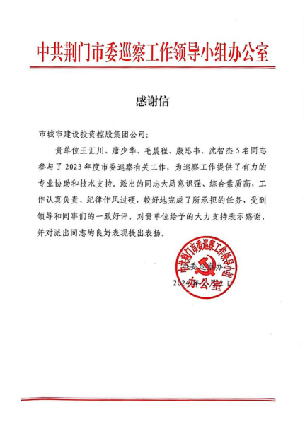 近日,集團收到市委巡察辦發(fā)來的感謝信,在2023年度市委巡察相關工作期間,王匯川、唐少華、毛晨程、殷思韋、沈智杰5名同志為巡察工作提供了有力的專業(yè)協(xié)助和技術(shù)支持。來信對以上同志的大局意識、綜合素質(zhì)、辦事態(tài)度、紀律作風等方面給予了充分肯定。
