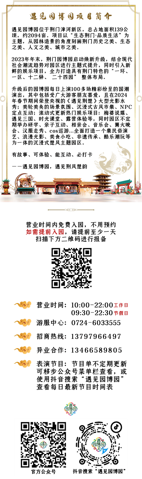 相信在未來,遇見園博園將在五一期間繼續(xù)舉辦草坪音樂節(jié)、萌寵樂園、露營帳篷以及獨(dú)具民族特色的非遺打鐵花、攔門酒、竹竿舞、國風(fēng)大典婚禮秀等特色活動,為廣大游客帶來更多驚喜與歡樂,為傳承和弘揚(yáng)荊楚文化作出更大的貢獻(xiàn)。