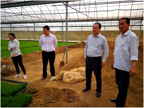 圖為城控集團(tuán)黨委書記、董事長杜佐鵬同志(右二)到蔣集村育秧基地實地察看