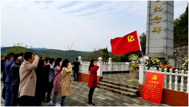 活動當天,全體黨員和入黨積極分子站在天星寨革命烈士紀念牌前,在主持人的帶領下,向革命先烈默哀,高唱國歌,面對鮮紅的黨旗重溫入黨誓詞,向革命烈士紀念牌敬獻花籃。隨后,在紅九師政治部舊址,黨總支書記李維波同志為全體黨員干部上了一堂生動的愛國主義黨課。