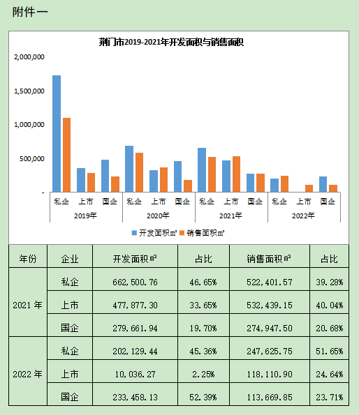 經(jīng)調(diào)查,荊門房地產(chǎn)市場(chǎng)近幾年整體呈現(xiàn)萎縮狀態(tài)(城區(qū)尤為突出),市場(chǎng)持續(xù)低迷、不穩(wěn)定性增加(今年上半年荊門城區(qū)僅成交土地1宗)。幾家大型房地產(chǎn)企業(yè)陸續(xù)因多元化、盲目擴(kuò)張、高杠桿拿地、疫情、無(wú)限制調(diào)控、市場(chǎng)下行、銀行三條紅線管控等原因出現(xiàn)資金斷裂,導(dǎo)致項(xiàng)目停工停產(chǎn)。東寶、掇刀原民營(yíng)企業(yè)開發(fā)的樓盤基本出現(xiàn)爛尾。從今年1-5月房地產(chǎn)情況看,東寶、掇刀、漳河新區(qū)同比分別負(fù)增長(zhǎng)70.2%、49%、1.2%,出現(xiàn)斷崖式下滑。2019年-2021年間,荊門城區(qū)整體開發(fā)面積從258萬(wàn)方下降至142萬(wàn)方,下降幅度達(dá)44.8%。從各類型企業(yè)來(lái)看,降幅最大的是民營(yíng)私企,下降幅度達(dá)61.8%。截至2021年底,荊門城區(qū)已批準(zhǔn)預(yù)售尚未網(wǎng)簽的商品住房 16293套,面積189.6萬(wàn)方。2022年,整體形勢(shì)依然不容樂(lè)觀,僅有央企、市屬國(guó)企、上市民企(洋豐集團(tuán))占主導(dǎo)地位。上半年僅完成開發(fā)面積44萬(wàn)方,其中國(guó)有企業(yè)表現(xiàn)穩(wěn)定,完成開發(fā)量已接近去年全年水平。同期,房地產(chǎn)銷售面積同樣呈現(xiàn)持續(xù)下滑態(tài)勢(shì),其中民營(yíng)私企下滑幅度明顯,從110萬(wàn)方下降至52萬(wàn)方,國(guó)有企業(yè)銷售面積相對(duì)平穩(wěn)(附表見后)。