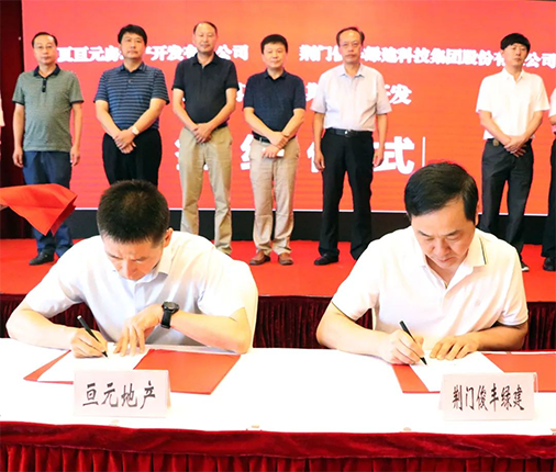 在雙方出席代表的見(jiàn)證下,荊門(mén)城建集團(tuán)總經(jīng)理兼荊門(mén)俊豐綠建集團(tuán)董事長(zhǎng)葉東與亙?cè)禺a(chǎn)總經(jīng)理劉向坤簽署合作協(xié)議。(文、圖:李曉旭 李文翔 熊飛)