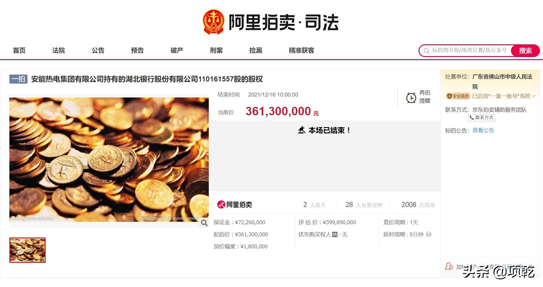 此次被拍賣的湖北銀行股權(quán)為安能熱電集團有限公司持有的1.10161557億股,被債權(quán)人廣東順德銀行申請司法拍賣。2021年8月,荊門城控集團得知這一消息后,立即與湖北銀行取得聯(lián)系,詳細(xì)了解了相關(guān)情況,并開展了市場盡調(diào),對競拍湖北銀行股權(quán)可行性進行了深入分析。經(jīng)荊門城控集團黨委研究后,報荊門市政府國資委批準(zhǔn),以荊門城控集團本部為主體參與此次競拍。安能熱電集團持有的1.10161557億股評估價格為399,890,000元,12月15日在淘寶網(wǎng)公開拍賣,荊門城控集團以起拍價成功競得。