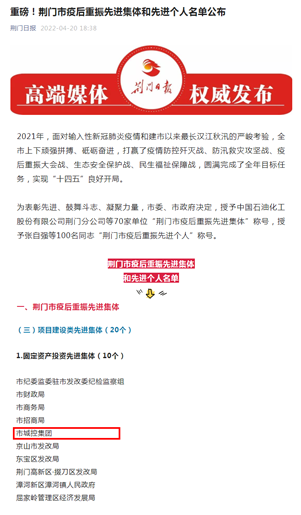 近日,市城控集團(tuán)被市委、市政府授予“荊門(mén)市疫后重振先進(jìn)集體”項(xiàng)目建設(shè)類(lèi)中的“固定資產(chǎn)投資先進(jìn)集體”稱(chēng)號(hào)。