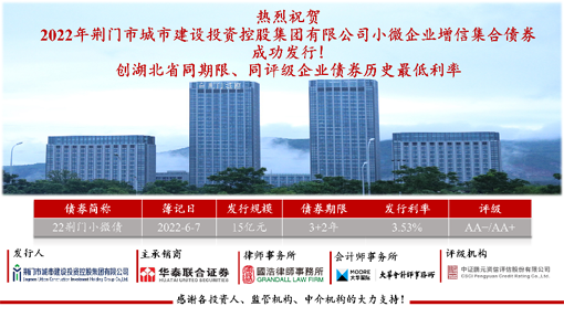 6月7日下午,經(jīng)過(guò)2小時(shí)的緊張簿記,華泰聯(lián)合證券作為主承銷(xiāo)商申報(bào)的市城控集團(tuán)2022年小微企業(yè)增信集合債券成功簿記發(fā)行,發(fā)行額度15億元,期限5(3+2)年,票面利率3.53%,認(rèn)購(gòu)倍數(shù)2.3倍,創(chuàng)湖北省同主體評(píng)級(jí)、同期限企業(yè)債券歷史最低利率水平!