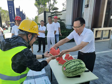 張本華帶領(lǐng)園林建設(shè)集團(tuán)班子成員深入秀江南、三國文化創(chuàng)意產(chǎn)業(yè)園項(xiàng)目現(xiàn)場,慰問一線施工人員,發(fā)放礦泉水、西瓜等防暑降溫物品,并認(rèn)真察看項(xiàng)目建設(shè)情況,詳細(xì)了解基層群眾工作狀況。張本華對一線工作人員辛勤付出給予高度贊揚(yáng),并要求項(xiàng)目負(fù)責(zé)同志在嚴(yán)格落實(shí)施工建設(shè)任務(wù)的同時(shí),認(rèn)真做好防暑保障措施,儲(chǔ)備發(fā)放防暑救護(hù)應(yīng)急藥品,彈性安排作息時(shí)間,增強(qiáng)自我防護(hù)意識(shí),切實(shí)保障職工生產(chǎn)安全和身體健康。