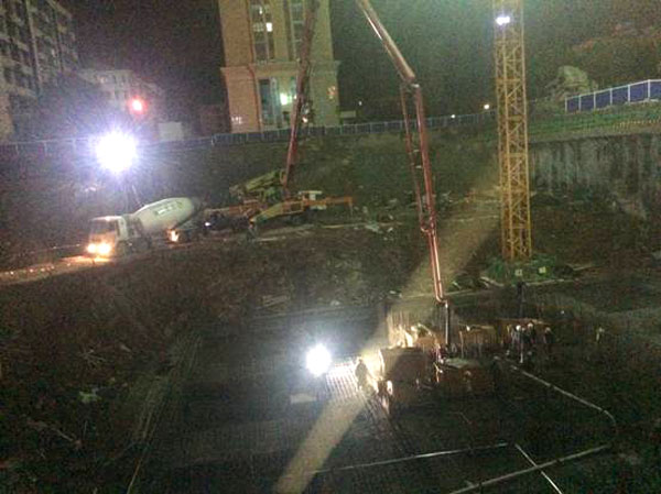 二醫(yī)綜合大樓項目地下室基礎(chǔ)底板分A、B、C三部分,其中A區(qū)基礎(chǔ)埋置深度最深,施工難度最大,A區(qū)底板混凝土澆筑從5月19日19時正式拉開帷幕。為保證大體積混凝土的澆筑質(zhì)量和一次性順利完成,建設(shè)、施工、監(jiān)理等參建各方項目管理人員針對施工場地狹小、工期緊等難題,超前策劃部署,精心制定了澆筑方案。從施工技術(shù)準(zhǔn)備、現(xiàn)場準(zhǔn)備到質(zhì)量控制、安全措施、勞動力組織、交通疏導(dǎo)、交管城管手續(xù)等方面作了充分的準(zhǔn)備。市康城房地產(chǎn)公司多次組織工程技術(shù)人員和現(xiàn)場施工人員召開專項方案會議,安排交底工作,詳細(xì)講解澆筑方案,并進(jìn)行分工責(zé)任到人。澆筑現(xiàn)場采用一臺地泵,兩臺天泵輸送,底板混凝土澆筑采取一次性連續(xù)澆筑,澆筑采取分層布料,先深后淺,分層間隔,循序漸進(jìn)的方法施工,確保按期完成澆筑施工。