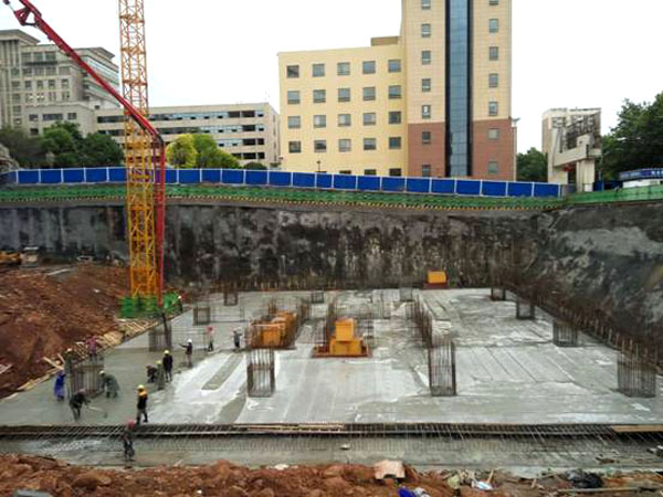 圖為二醫(yī)綜合大樓基礎(chǔ)底板澆筑現(xiàn)場