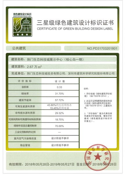 圖為生態(tài)科技城三星級綠色建筑設(shè)計標(biāo)識證書