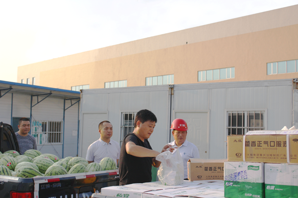 夏日炎炎,氣溫一路攀升。面對入伏以來出現(xiàn)的持續(xù)高溫晴熱天氣,7月22日,市建筑總公司黨委書記陳國新、副總經(jīng)理何中輝、羅小寧帶領(lǐng)公司機(jī)關(guān)相關(guān)科室人員,冒著高溫酷暑,對我公司在中心城區(qū)承建的俊豐鋼構(gòu)、愛飛客、新晨御苑、譚店農(nóng)產(chǎn)品展示中心等十多個在建項目進(jìn)行了“夏日送清涼 施工保平安”慰問活動,為各項目部送去了西瓜、礦泉水、清涼油、風(fēng)油精、藿香正氣水、人丹等防暑降溫藥品,為一線職員送去滿滿的關(guān)心和誠摯的慰問。