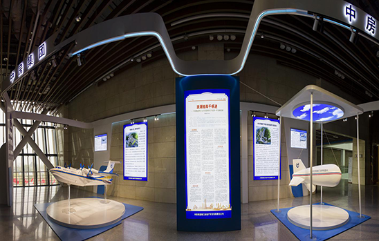 整座展廳占地面積80平方米,高4.2米,設(shè)計如鯤鵬展翅外形,映襯以藍天白云,所展示的AG600水陸兩棲飛機模型凌空翱翔,系留氣球平臺浮空萬里,視覺效果極佳。